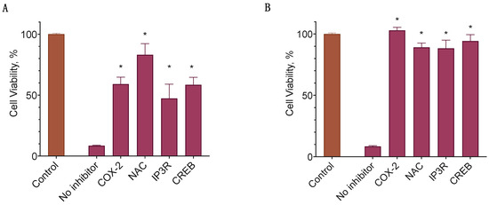 In both cell lines, NAC and diclofenac substantially reduced the cytotoxic effect of 2-ADFP, indicating the crucial role of the enzyme (Figure 7). Xestospongin C was also active in both cell lines; however, in the MDA-MB-231 cell line, it only reduced the cytotoxicity by about 50%. This agrees with the data on the participation of the TRPV1 receptor in the 2-ADFP signaling in this cell line.