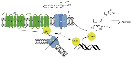 In this paper, we evaluated the mechanism of cell death indication by 2-AG in six human breast cancer cell lines of different tumor degrees, and the influence of LPI on it. 2-AG induced cell death via the CB2- and TRPV1-dependent COX-2 induction and oxidized metabolite production. The activity was enhanced by LPI.
