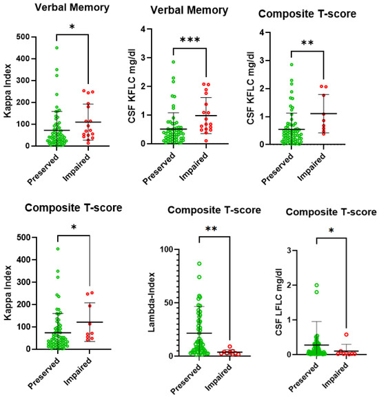 Patients with impaired VM and CI (particularly at the composite T-score) showed increased CSF KFLCs (respectively p: 0.0003 and p: 0.003) and kappa-Index (respectively p: 0.01 and p: 0.02) compared to those with normal VM and no CI, as reported in Table 3 and Figure 1, whereas patients with lower CSF LFLC and lambda-Index displayed lower composite scores (p: 0.04 and 0.001 Table 3 and Figure 1).