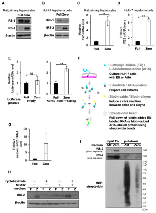 Effects of amino acid deprivation on IRS2 mRNA levels and IRS-2 protein levels in hepatocyte-derived cells. Rat primary hepatocytes (A) and HuH-7 human hepatoma cells (B) were cultured for 24 h in a medium containing 20 amino acids (Full) or in a medium with no amino acids (Zero). Rat primary hepatocytes (C) and HuH-7 human hepatoma cells (D) were cultured for 12 h in the Full or Zero medium. (E) HuH-7 cells were transfected with firefly luciferase reporter plasmids (empty or hIRS2 containing −1098/+450 bp of the human IRS2 gene promoter region). Then 39 h after transfection, the spent media were changed and cells were cultured for an additional 9 h. (F) Method for extracting newly synthesized mRNA or protein from cells. (G) HuH-7 cells were cultured in Full or Zero medium with 0.5 µM 5-ethynyluridine for 6 h. (C–E,G) IRS2 mRNA levels (C,D,G) or firefly luciferase mRNA levels (E) were measured using real-time qPCR. (H) HuH-7 cells were cultured in Full or Zero medium with or without 10 µg/mL cycloheximide or 10 µM MG132 for 24 h. (I) HuH-7 cells were cultured in methionine-depleted medium (ΔM medium) or Zero medium for 14 h. Next, 50 µM L-azidehomoalanine (AHA) was added to the medium and the cells were cultured for an additional 4 h. (A,B,G,H) Cell lysates were subjected to immunoblotting. In (C–F), IRS2 mRNA levels (C,D,F) or firefly luciferase mRNA levels (E) were normalized against ACTB mRNA levels. Bar graphs are presented as the fold changes of the columns on the far left. Bar: mean ± S.E.M. NS not significant, * p < 0.05, ** p < 0.005, Student’s t-test. (C–E): n = 3, (G): n = 6. The experiments were performed multiple times independently and a representative result was presented.