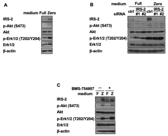 IRS-2 is a well-known mediator of the insulin signaling pathway. Hence, we then examined whether amino acid deprivation activated insulin signaling pathways. HuH-7 cells were cultured in Full or Zero medium for 24 h and then we examined the phosphorylation levels of Akt, a downstream kinase of the PI-3K pathway, and Erk1/2, a downstream kinase of the MAPK pathway. Amino acid deprivation increased the phosphorylation of Akt and Erk1/2 upon insulin stimulation (Figure 2A). Notably, Akt phosphorylation was suppressed by IRS-2 knockdown but not by the insulin/IGF-I receptor kinase inhibitor BMS-754807 (Figure 2B,C). In contrast, Erk1/2 phosphorylation was not suppressed upon IRS-2 knockdown (Figure 2B). These results indicate that PI-3K pathway activation in the Zero medium occurred in an IRS-2-dependent manner, but MAPK pathway activation did not occur through IRS-2.