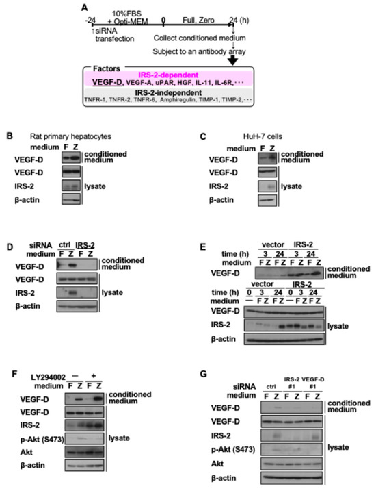 Effects of amino acid deprivation and increase in IRS-2 protein levels on VEGF-D secretion. (A) HuH-7 cells were transfected with control siRNA or siRNA against IRS-2. Then 24 h after transfection, media were changed to Full or Zero medium and the cells were cultured for an additional 24 h. The conditioned media were collected and subjected to an antibody array. Rat primary hepatocytes were cultured for 6 h in Full or Zero medium (B) and HuH-7 human hepatoma cells were cultured for 24 h in Full or Zero medium (C). (D) HuH-7 cells were transfected with control siRNA or siRNA against IRS-2. Then 24 h after transfection, the spent media was changed to Full or Zero medium and cells were cultured for an additional 24 h. (E) HuH-7 cells stably expressing IRS-2 or vector were cultured in Full or Zero medium for 0, 3, or 24 h. (F) HuH-7 cells were cultured in Full or Zero medium with or without 10 µM LY294002 for 24 h. (G) HuH-7 cells were transfected with control siRNA, siRNA against IRS-2, or VEGF-D. Then 24 h after transfection, the spent media was changed to Full or Zero medium and the cells were cultured for an additional 24 h. (B–G) The cell lysates and their conditioned medium were subjected to immunoblotting. The experiments were performed multiple times independently and a representative result was presented.