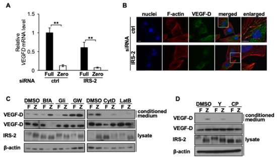 Next, we examined how IRS-2 increases extracellular VEGF-D protein levels. VEGFD mRNA levels decreased when cells were cultured in Zero medium and remained unchanged upon IRS-2 knockdown (Figure 4A), suggesting that the reduced extracellular VEGF-D protein levels in IRS-2 knockdown cells were not due to a decrease in the amount of VEGF-D mRNA. Immunostaining analysis using an anti-VEGF-D antibody revealed that VEGF-D partially colocalized with F-actin in HuH-7 cells (Figure 4B, upper panel, white arrows) and this colocalization disappeared in IRS-2 knockdown cells (Figure 4B, lower panel). Since VEGF-D secretion may be regulated by extracellular vesicles (EVs), we treated cells with various chemicals that block or enhance secretory pathways. Notably, treatment with GW4869, which is known to inhibit exosome secretion but increase microvesicle (MV) secretion [27,28], significantly increased VEGF-D secretion (Figure 4C). In contrast, VEGF-D secretion decreased after treatment with Y-27632 or calpeptin, which inhibited MV secretion at different points [28] (Figure 4D).