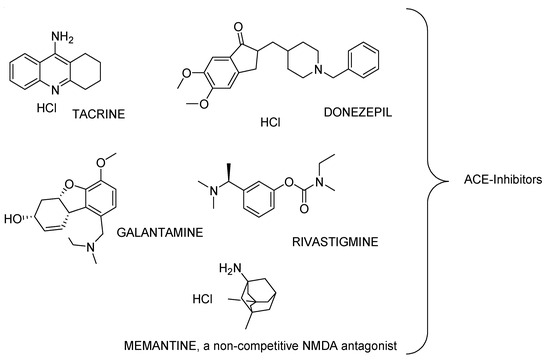The acetylcholinesterase inhibitor (AChEI) tacrine (Chart 1) was the first drug to be approved for the treatment of AD but is now rarely used because of its hepatotoxicity. Later, three other AChEIs, donepezil, rivastigmine, and galantamine, reached the market, becoming the standard for AD therapy, only later complemented by memantine, a noncompetitive NMDA antagonist (Chart 1). Table 4 includes the advantages and disadvantages connected to the use of such therapeutics.