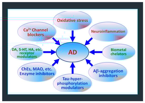 Also, the endoplasmic reticulum (ER) is an essential apoptotic factor. It has been shown that, in AD, apoptosis provoked by badly bent proteins encompasses ER impairment. Moreover, the alteration of the state of phosphorylation of some pivotal proteins involved in the pathogenic cascades represents an additional mechanism usually shared by NDs. In addition to the extensively recognized hyperphosphorylated state of τ protein in the neurofibrillary tangles observed in AD brain, other specific impaired kinase and phosphatase activities are coupled to alterations in the phosphorylation state of disease-specific proteins, which are specific for PD, ALS, and HD. Several molecular evidence demonstrated a cell-type specificity in neuronal disorders and selective neuron degeneration in AD. Nevertheless, these general mechanisms alone are not sufficient to explain the high number of biochemical and pathological abnormalities of AD. Collectively, disfunctions in AD incorporate a multitude of cross-related cellular and biochemical changes that cannot be effectively addressed by using treatments based on a one-molecule, one-target paradigm. In our opinion, there is a growing interest and urgent need for the development of multi-target directed ligands (MTDLs) to provide real disease-modifying drug candidates for this ND.
