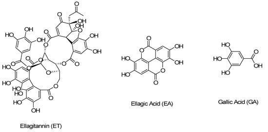 In this worrying scenario concerning the poor available arsenal of drugs and/or nano-drugs to treat AD, the several multitarget health effects of many fruits and vegetables could represent an appealing alternative treatment option. In fact, it has been demonstrated that foods including muscadine grape; berries such as pomegranates, strawberries, raspberries, and blackberries; nuts such as chestnuts, walnuts, almonds, pecans, and pistachios; herbs such as Camellia sinensis, seeds including berry seeds; and their derived foods and/or beverages possess recognized healthy and/or preventive effects against several complex human diseases, thus evidencing their multitarget behavior [14]. Such effects have been mostly associated with their high content of antioxidant molecules, mainly polyphenols [14,15,16], such ellagitannins (ETs), as well as gallic acid (GA) and ellagic acid (EA), which are produced via their hydrolysis in vivo (Figure 2) [17]. By limiting the hyperproduction of RONS, they counteract OS, recognized as the foremost prompting factor of several human discomforts.