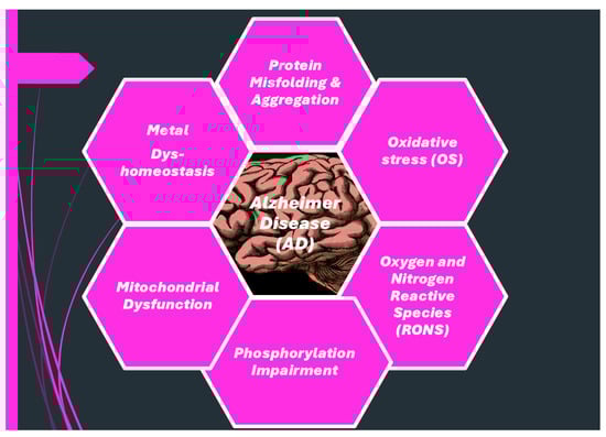 Alzheimer–Perusini disease, mainly known as Alzheimer’s disease (AD), presenile dementia of the Alzheimer’s type, primary degenerative dementia of the Alzheimer’s type, and, for simplicity, Alzheimer’s, is the most common form of progressively disabling degenerative dementia, with onset mainly in presenile age, specifically over 65 years [1]. It is estimated that approximately 50–70% of cases of dementia are due to the AD condition, while 10–20% are due to vascular dementia [2]. Some data from the World Alzheimer Report 2023 produced by Alzheimer’s Disease International established that in the next 25 years, the number of people living with dementia worldwide could increase from 55 million to 139 million. Furthermore, the costs associated with the disease could jump from USD 1.3 trillion in 2019 to over 2.8 in 2030. The most frequent early symptom is represented by difficulty in remembering recent events, followed by other symptoms that may appear with aging, including aphasia, disorientation, sudden changes in mood, depression, inability to take care of oneself, and behavioural problems. Also, confusion, irritability and aggressiveness, mood swings, difficulty speaking, both short- and long-term memory loss, and progressive sensory dysfunction further aggravate the already detrimental condition of patients suffering from AD [3,4]. The subject tends to isolate himself from society and family, and gradually, basic mental abilities are lost. It seems that about 70% of AD development is genetic, with several genes usually involved. However, the exact cause and progression of AD are still not well understood. It is well established that AD is a well-unshakable neuronal dysfunction whose primary causes could be associated with toxin insults, heredity, metabolism, or even attack by infectious pathogens [5]. Several research studies indicate that AD is closely correlated with amyloid plaques and neurofibrillary tangles found in the brain, but the root cause of this degeneration is unknown [6]. Other well-explored factors contributing to cognitive neurodegeneration driving AD comprise excessive acetylcholine esterase enzymes (AChE), β amyloid (βA) precursor protein-cleaving enzyme 1 (BACE-1), glycogen synthase kinase 3 β (GSK-3 β), monoamine oxidases (MAOs), metal ions in the brain, N-methyl-D-aspartate (NMDA) receptor, and phosphodiesterase (PDE). It is extensively recognized that OS, as well as the formation of free radicals and not radical RONS, are strongly involved in the progression of brain aging and in the onset and evolution of AD. In addition, impaired bioenergetics, mitochondrial abnormalities, and neuroinflammatory processes are implicated. Collectively, one hundred years after AD discovery, experts in the field are confident in asserting that, even if AD’s pathogenesis is not yet entirely understood, it is a multifactorial disorder whose causes can be genetic, environmental, and endogenous (Figure 1), like other neurodegenerative diseases [7]. The excessive incorrect folding and aggregation of proteins often related to the ubiquitin–proteasomal system (UPS) are also accountable to AD.