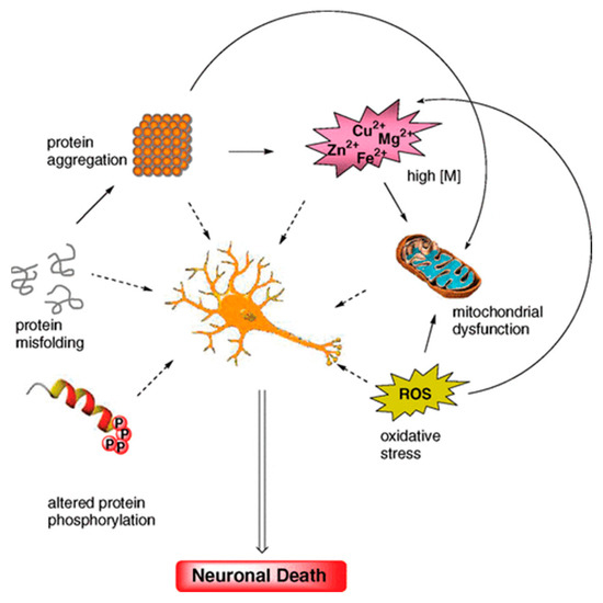 Schematic routes of the multifactorial events leading to neuronal death. General mechanisms, such as protein non-correct folding and aggregation, OS, metal (M) dyshomeostasis, mitochondrial impairments, and distorted protein phosphorylation, have been found in several neuronal disorders. Readapted with PERMISSION/LICENSE GRANTED AT NO CHARGE by ACS Chemical Neuroscience (American Chemical Society) from [7].