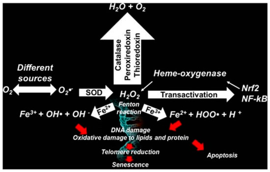 Figure 5 specifically schematizes the main endogenous processes by which ROS can be created in cells and the detrimental effects they can have on health [30], including DNA damage, lipid and protein peroxidation, telomere reduction, aging, and death.