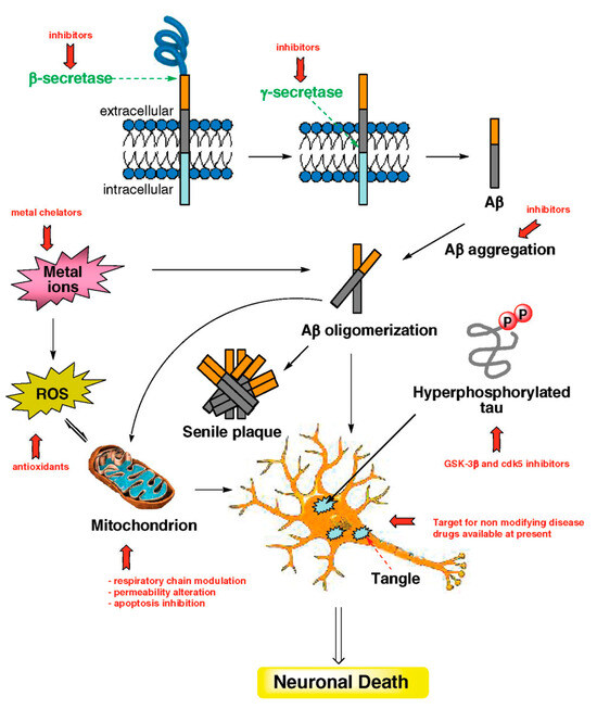 Possible molecular causes of neuronal death and protective cyclic mechanisms in AD. The central event in AD pathogenesis is an imbalance between Aβ production and clearance. The enhanced activity of β- and γ-secretases leads to increased release of amyloidogenic Aβ42, which forms oligomers and then extracellular deposits (senile plaques). In this regard, one way to confront AD pathogenesis may be to combat the oligomerization processes by means of small molecules. The role of metal ions and ROS in Aβ oligomerization has also been advanced. Therefore, metal chelation and antioxidants are two general mechanisms to be considered in the search for disease-modifying anti-AD drug candidates. Also, β- and γ-secretase inhibitors may be promising lead compounds because they tackle an early event in AD pathogenesis. Mitochondrial dysfunction plays a fundamental role in the neuronal death associated with AD, as it is likely that intracellular Aβ could compromise the function of this organelle. τ hyperphosphorylation leading to tangle formation is regarded as a downstream event but could contribute to reinforcing neuronal dysfunction and cognitive impairment. Readapted with PERMISSION/LICENSE GRANTED AT NO CHARGE by ACS Chemical Neuroscience (American Chemical Society) from [7].