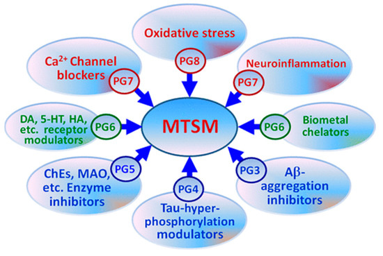 Ideal and efficient MTSMs (equal to, say, MTDLs) for AD therapy, showing their corresponding pharmacophoric groups (PG). Readapted with PERMISSION/LICENSE GRANTED AT NO CHARGE by ACS Chemical Neuroscience (American Chemical Society) from [8].