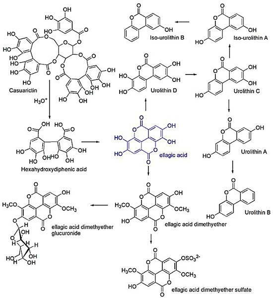 A representative structure of an ET (casuarictin); that of EA; and those of URO A, B, C, D, iso-A, and iso-B are shown in Scheme 1, which shows the path of EA formation after the intake of ETs-rich foods and its subsequent metabolism to UROs and dimethyl ether derivatives [17]. A more recent article has also introduced URO-M5 and M6 among the URO-type metabolites of EA [150]. Precisely, in this new route, EA is transformed into URO-M5, which is in turn converted into URO-D, while URO-M5 is converted into URO-M6, which then provides URO-C as URO-D [150].