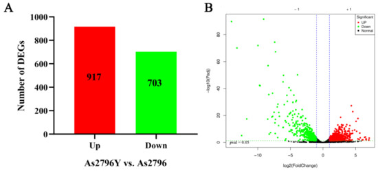 To identify differentially expressed genes (DEGs) between As2796 and As2796Y samples, the expression level of each transcript was quantified using the transcripts per million reads (TPM) method. Gene abundances were calculated using RSEM (V1.3.3, http://deweylab.biostat.wisc.edu/rsem/, accessed on 25 March 2023) [35]. Differential expression analysis was performed using DESeq2/DEGseq/EdgeR with a Q value ≤ 0.05, considering DEGs with |log2FC| > 1 and Q value ≤ 0.05 (DESeq2 or EdgeR)/Q value ≤ 0.001 (DEGseq) as significantly differentially expressed genes [36,37,38]. Additionally, functional enrichment analysis including gene ontology (GO) and Kyoto Encyclopedia of Genes and Genomes (KEGG) was conducted to identify significantly enriched DEGs in GO terms and metabolic pathways at a Bonferroni-corrected p-value ≤ 0.05 compared to the whole-transcriptome background. GO functional enrichment and KEGG pathway analysis were carried out using Goatools (V1.3.11, https://github.com/tanghaibao/Goatools, accessed on 26 March 2023) and KOBAS (V3.0.3, http://kobas.cbi.pku.edu.cn/home.do, accessed on 26 March 2023) [39].