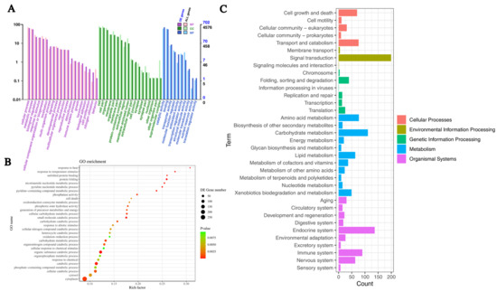 Functional analyses of transcripts within transcriptome. (A) Boxplot of GO enrichment analysis of DEGs enriched in BP, CC, and MF. (B) Top 30 GO enrichment analysis of down-regulated DEGs. (C) KEGG enrichment analysis of DEGs.