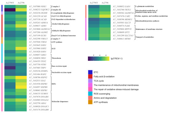 Heatmap of main DEGs involved in mitochondrial function. The different colors indicate the expression level changes between As2796Y and As2796 with lg(FPKM + 1).