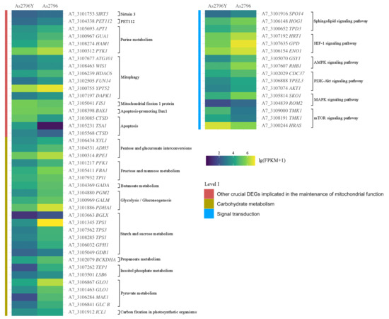 Heatmap of other DEGs involved in mitochondrial function. The different colors indicate the expression level changes between As2796Y and As2796 with lg (FPKM + 1).