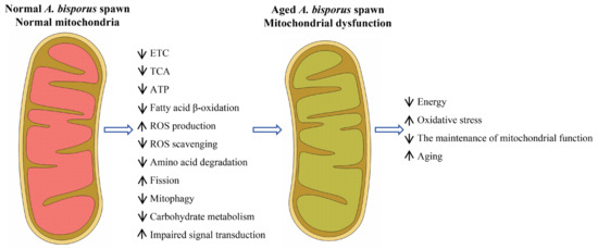 Schematic diagram of a model of mitochondrial dysfunction in A. bisporus spawn aging.