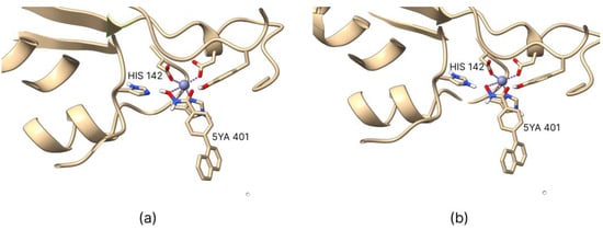 The protonation states of the histidine residues of the histone deacetylase (HDAC) 8 enzyme remained unchanged from the PDB file for the protonated ligand series (a), with His142 protonated in the deprotonated ligand series (b). Images were generated using UCSF ChimeraX software, and the co-crystallized hydroxamic ligand 5YA 401 was shown as a reference.