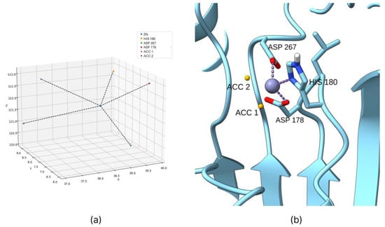 A notable limitation of the AutoDock Bias algorithm is its inability to assign biases to the zinc ion due to the complex nature of its coordination bonds, which cannot be generalized and must be assessed individually for each protein. To address this, the coordination geometry of the zinc ion within HDAC enzymes was studied using co-crystallized PDB structures containing hydroxamic acid as a co-crystallized ligand. The analysis revealed that the coordination geometry is consistently maintained across all examined PDB entries, with zinc ions coordinated by two histidine residues and one aspartate residue. Based on this observation, a Python script was developed to predict the ideal positions of hydrogen bond acceptor groups in the ligand, using the known coordination geometry once the co-crystallized ligand is removed.