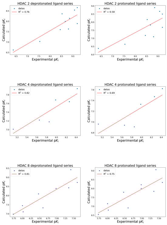 Correlation graphs of HDAC 2 (top), HDAC 4 (middle), and HDAC 8 (bottom). Graphs show the data distribution (blue dots) and the linear regression line (red line) of correlations between experimental and calculated pKi for the deprotonated ligand series (left) and the protonated ligand series (right).