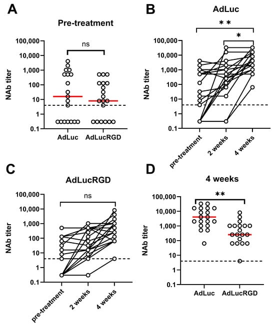 Adenovirus neutralizing antibody titers in the serum of patients with recurrent glioblastoma undergoing treatment by intracranial infusion of oncolytic adenovirus Ad5-∆24.RGD. Titers are derived from the serum dilution titration experiments shown in Figures S1 and S2. The assay detection limit (4) is shown in all panels (dashed line). Samples with undetectable NAb titer are shown at arbitrary positions below the detection limit. (A) Pre-treatment titers of antibodies that neutralize AdLuc and AdLucRGD. (B) Comparison of titers before and at 2 and 4 weeks after Ad5-∆24.RGD infusion, for antibodies that neutralize AdLuc. (C) Comparison of titers before and at 2 and 4 weeks after Ad5-∆24.RGD infusion, for antibodies that neutralize AdLucRGD. (D) Titers of antibodies that neutralize AdLuc and AdLucRGD, 4 weeks after Ad5-∆24.RGD infusion. Individual data points for all 19 patients are shown in all panels, with medians in panels A and D indicated with red lines. Statistical tests used are paired two-way t-test in (A,D) and One-Way ANOVA on matched data, with Tukey’s multiple comparisons test in (B,C). ns, not significant; *, p < 0.05; **, p < 0.01.