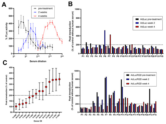 Here, we contribute to these investigations by analyzing NAb titers in the serum of patients with recurrent glioblastoma who were infused with oncolytic adenovirus Ad5-∆24.RGD via convection-enhanced delivery (CED) to the tumor and to the surrounding tumor-infiltrated brain in a completed clinical trial (NCT01582516) [24]. Pre-existing and elicited neutralization was determined using a native Ad5 vector and an RGD-modified Ad5 vector to distinguish between neutralization of the two alternative cell entry pathways used by Ad5-∆24.RGD. We show that intra- and peritumoral infusion of Ad5-∆24.RGD induced mainly neutralization of adenovirus native tropism. In cerebrospinal fluid (CSF), neutralizing activity against RGD-mediated infection remained very low. Interestingly, in the course of these experiments, we discovered that the blood serum of most humans promotes, in particular, RGD-mediated uptake of recombinant adenovirus in human cells. The infection-stimulating serum factor seems distinct from serum proteins known to promote Ad5 infection.