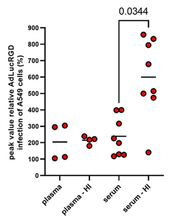All NAb titration experiments were performed with heat-inactivated serum or CSF to inactivate the complement system. This was done to avoid antibody-dependent complement activation [33] and opsonization of adenovirus particles with complement factors, which neutralizes the virus [34,35] and could thus confound NAb quantification. Apart from the intended complement inactivation, heating can also change serum protein composition [36], promote the formation of immunoglobulin aggregates [37] and influence the cellular uptake of nanoparticles [36,38]. Therefore, we compared AdLucRGD infection in the presence of serum samples from eight Ad5-∆24.RGD-treated glioblastoma patients that were either left untreated or were heat-inactivated. In addition, since blood coagulation factors are known to influence Ad5 infection [39], we also compared the presence of the infection-promoting factor in plasma versus serum. This was done by including matching plasma samples that were available from four of the eight selected patients. As can be seen in Figure 4, mean infection efficiencies were above 200% compared with medium controls for all four sample types. Notably, infection of A549 cells with AdLucRGD was stimulated similarly by the selected serum and plasma samples but was higher when serum was heat-inactivated (p = 0.034 compared with untreated serum and p = 0.069 compared with heat-inactivated plasma).