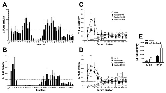 To separate infection-promoting and neutralizing activities, we fractionated serum samples by size exclusion. For this, we used two samples from patient #7 collected on days 3 and 4 after oncolytic adenovirus infusion that contain NAbs as well as the putative RGD-mediated infection-promoting factor. Individual elution fractions were scanned for their effect on the transduction of A549 cells with AdLucRGD at low sample dilution (Figure 5A,B). Neutralizing activity and infection-promoting activity were observed in different fractions. Early and late eluting fractions (containing molecules with high and low MW, respectively) revealed infection-promoting activity; neutralization was seen in fractions representing mid-weight molecules. Next, dilution titrations were performed with selected fractions containing infection-promoting and neutralizing activities in comparison to the complete input serum used for fractionation (Figure 5C,D). As can be seen, the medium MW fractions of both samples neutralized AdLucRGD at approximately 3–5-fold reduced efficacy compared with input samples. In contrast, the selected low and high-MW fractions stimulated infection. In these fractions, infection-promotion was 2–3-fold stronger than observed for unfractionated serum, suggesting that these fractions were depleted of NAbs. Size exclusion thus separated the infection-stimulating and neutralizing activities. Finally, to test our assumption that the medium MW fractions that inhibited infection with AdLucRGD contained NAbs, we depleted these fractions of IgG antibodies using protein-G-coated beads (Figure 5E). IgG depletion reduced neutralization, confirming that this was caused by NAbs. Remarkably, IgG depletion of the day-4 sample revealed modest infection-promoting activity also in the medium MW fraction. Hence, infection-promoting activity was found in fractions representing a broad range of molecular weights. Therefore, on the basis of these experiments, the molecular weight of the infection-promoting factor(s) could not be estimated.