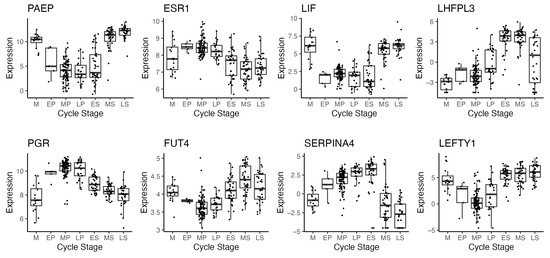 Examples of genes that significantly change in the menstrual cycle. Gene expression from RNA-seq with samples histologically dated from the menstrual (M), early proliferative (EP), mid-proliferative (MP), late proliferative (LP), early secretory (ES), mid-secretory (MS), or late secretory (LS) phase. Each data point represents an endometrial sample taken from a unique patient. Data are from GEO Series GSE234354 [27].