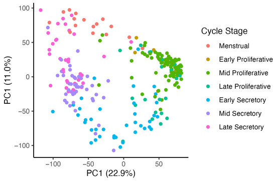 A PCA plot of RNA-seq gene expression data from endometrial tissue samples from across the menstrual cycle. The variance observed in the first two principal components primarily reflects menstrual cycle-related changes in gene expression. Data are from GEO Series GSE234354 [27].