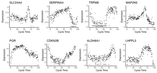 Examples of genes that significantly change expression in the menstrual cycle identified using molecular methods for estimating menstrual cycle time. Each data point represents an endometrial sample taken from a unique patient. Time 0 corresponds to the beginning of menstruation and time 100 corresponds to the conclusion of the secretory phase. Gene expression from RNA-seq with cycle time was estimated using the endest R package [27]. Data are from GEO Series GSE234354 [27].