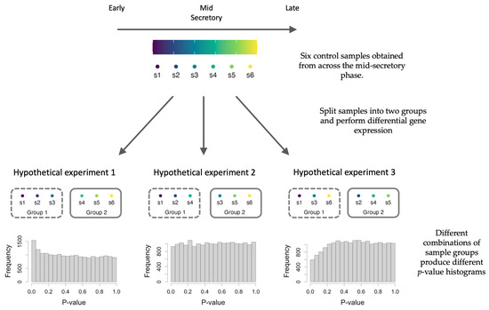An illustration of the effects of cycle time being confounded with experimental groups. All samples are histologically dated as mid-secretory and are all control samples. The samples are separated into two groups to perform differential gene expression and three different combinations of comparisons are shown. p-value histograms are useful for diagnosing issues [59]. Under the null, we expect a flat distribution, as seen in hypothetical experiment 2. The composition of different samples for each experimental group can determine the distribution of p-values, e.g., conservative, flat, and anti-conservative distributions. Severe imbalances such as in hypothetical experiment 1 can result in an anti-conservative p-value distribution which can result in identifying false positive effects that are due to cycle effects. In a real experiment, it would not be possible to distinguish if the effect is due to the confounding variable or the effect of interest.