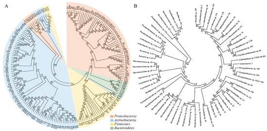 Phylogenetic tree of endophytic bacteria isolated from Kalidium schrenkianum based on 16S rRNA sequencing. The phylogenetic tree was constructed using the neighbor-joining method in MEGA 11 software. (A) Different colors represent taxonomic levels at the phylum; (B) genus-level classification is shown on the right side of the tree.
