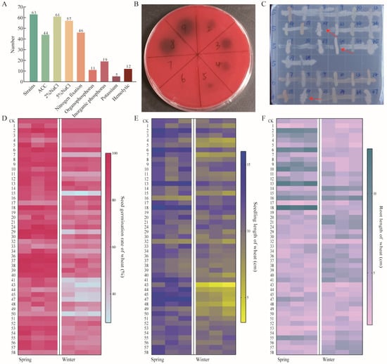 Screening of growth-promoting strains. (A) Functional characteristics of strains; (B) hemolytic activity; (C) strain antagonism, red arrows indicate strains that are antagonistic to each other; (D) effects of strains on seed germination rate of hydroponic wheat; (E) effects on seedling length; (F) effects on root length.
