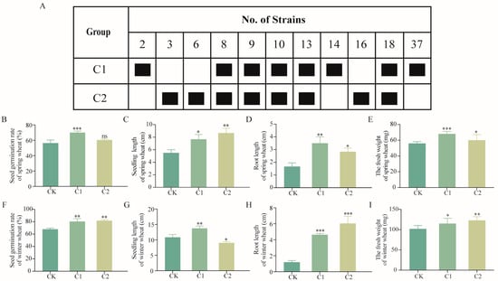 11 strains were randomly combined to form various synthetic communities, leading to the identification of two effective combinations, C1 and C2 (Figure 3A). C1 increased the germination rate of spring wheat by 24%, seedling height by 39%, root length by 100%, and fresh weight by 21% (Figure 3B–E). At the same time, C1 demonstrated a strong growth-promoting effect on winter wheat. Compared with the control group, C1 increased the germination rate of winter wheat by 18%, seedling length by 27%, root length by 300%, and fresh weight by 13% (Figure 3F–I). In contrast, C2 showed no significant effect on the germination rate of spring wheat (p > 0.05), and had a significant promoting effect on seedling length, root length, and fresh weight (p < 0.01, p < 0.05, p < 0.05), but the promoting effect on root length and fresh weight were weaker than that of C1 (Figure 3B–E). For winter wheat, C2 increased the germination rate by 20%, root length by 500%, and fresh weight by 21% (Figure 3F–I).
