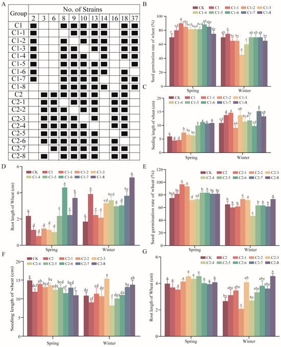 Optimization of SMCs. (A) Composition of C1, C2, and their derivative combinations; (B–D) effects of C1 and its derivatives on germination rate (B), seedling length (C), and root length (D) of spring and winter wheat; (E–G) effects of C2 and its derivatives on germination rate (E), seedling length (F), and root length (G) of spring and winter wheat. Data represent mean ± standard error (SE) and different letters indicate significant differences (p < 0.05, Tukey’s test, n = 15).