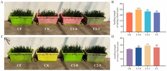 Effects of SMCs on potted wheat plants. (A) Morphological effects of C1-6 and C2-1 treatments on spring wheat; (B) seedling length of spring wheat under C1-6 and C2-1 treatments; (C) morphological effects of C1-8 and C2-3 treatments on winter wheat; (D) seedling length of winter wheat under C1-8 and C2-3 treatments. CK: seeds treated with water; CF: seeds treated with commercial fertilizer; C1-6, C2-1, C1-8, and C2-3: seeds treated with the respective bacterial solutions. Data represent mean ± standard error (n = 30) and were analyzed using one-way ANOVA, ns, p > 0.05; **, p < 0.01, ***, p < 0.001.