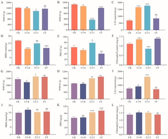 Effects of SMCs on enzyme activity and chlorophyll content in potted wheat. (A–F) Enzyme activity and chlorophyll content in spring wheat treated with C1-6 and C2-1. (G–L) Enzyme activity and chlorophyll content in winter wheat treated with C1-8 and C2-3. Data represent mean ± standard error (n = 10) and were analyzed using one-way ANOVA, ns, p > 0.05; *, p < 0.05; **, p < 0.01; ***, p < 0.001.
