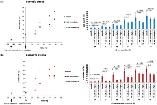 During oxidative stress induction (0 h, Figure 1b), the death of vehicle-treated cells increased to 32.50 ± 11.71% in comparison to nimodipine-treated cells (1 µmol/L, 8.45 ± 2.49%, p = 0.01; 10 µmol/L, 6.70 ± 2.30%, p = 0.01). Nimodipine treatment significantly decreased cell death at every observed time point. The cell death rate of the vehicle control increased from 41.43 ± 12.86% after 16 h to 60.59 ± 8.08% after 24 h, 62.37 ± 8.76% after 40 h, and 68.91 ± 13.83% after 48 h, whereas the cell death rate of the nimodipine-treated cells increased more slightly from 13.15 ± 1.88% (1 µmol/L) and 13.42 ± 1.91% (10 µmol/L) after 16 h, to 29.54 ± 7.08% (1 µmol/L) and 29.35 ± 6.53% (10 µmol/L) after 24 h, and to 46.71 ± 2.07% (1 µmol/L) and 41.94 ± 2.01% (10 µmol/L) after 48 h. Therefore, the highest impact of protective nimodipine treatment was observed at the stress induction time point during osmotic and oxidative stress.