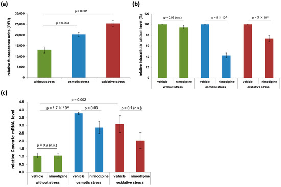 Without stress, no regulation of the voltage-dependent L-type calcium channel subunit 1c (Cacna1c) mRNA levels by nimodipine was detectable. Osmotic and oxidative stress led to the higher expression of Cacna1c, which is the main protein of a nimodipine target channel (Figure 2c). Stress induction increased the relative Cacna1c mRNA level from 1.04 ± 0.14 (without stress) to 3.79 ± 0.07 (osmotic stress, p = 1.7 × 10−6) and 3.10 ± 0.56 (oxidative stress, p = 0.002). However, if Cav1.2 was blocked by nimodipine treatment (10 µmol/L), the Cacna1c mRNA level was decreased 1.5-fold (p = 0.03) during osmotic stress and oxidative stress (n.s., not significant) (Figure 2c). Voltage-dependent L-type calcium channel subunit 1d (Cacna1d), which is also blocked by nimodipine, was not expressed in the used cell models.