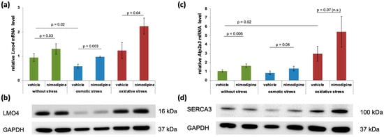 The results shown in Table 1 led to closer analyses of Lmo4 and Atp2a3 (Figure 3). The relative Lmo4 mRNA level was weakly induced by nimodipine pre-treatment without stress (0.95 ± 0.16 to 1.30 ± 0.22, p = 0.03) and under osmotic stress (0.59 ± 0.09 to 0.98 ± 0.03, p = 0.003). The relative Lmo4 mRNA level was about two-fold higher under oxidative stress (1.24 ± 0.32 to 2.25 ± 0.33, p = 0.04) (Figure 3a). Immunoblot analysis showed no visible induction of LMO4 protein levels without stress after nimodipine pre-treatment and under oxidative stress. Osmotic stress resulted in a significant reduction in LMO4. After nimodipine pre-treatment, an increase in the transcription co-factor was detectable for both osmotic and oxidative stress (Figure 3b).