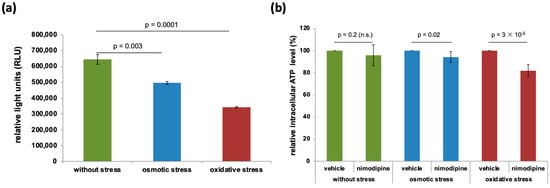 Intracellular ATP measurements during stress and nimodipine treatment. A total of 5 × 104 SW10 cells per sample were seeded and treated as described in the Materials and Methods Section. The intracellular ATP content was measured using a CellTiter Glo luminescence assay. The plot of relative light units shows the influence of different stress conditions, which decreased under osmotic as well as under oxidative stress compared to untreated cells (a). To investigate the influence of nimodipine, untreated SW10 cells were set to 100% and compared to pre-treated cells, which showed no relevant decrease (b). The diagrams were obtained from three independent biological replicates. Statistical analysis was performed with one-way ANOVA followed by Dunnett’s post hoc test. Significance was accepted if the p-Value was ≤0.05. n.s., not significant.