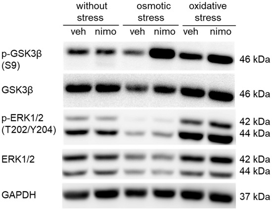 Western blot analyses were used to investigate the influence of nimodipine pre-treatment under different stress conditions on GSK3β and ERK1/2 and their activation through phosphorylation (Figure 5). The phosphorylation of ERK at T202/Y204 leads to the activation of its kinase activity [21], whereas the phosphorylation of GSK at serine 9 causes an inhibition of its activity by blocking the substrate binding [22]. There was no change in the phosphorylation of GSK3β (S9) and ERK1/2 (T202/Y204) in SW10 cells pre-treated with nimodipine compared to those without pre-treatment (without stress). Exposure to osmotic stress resulted in a decrease in the activation of GSK3β and ERK1/2. However, treatment with nimodipine led to a significant increase in GSK3β activation and a slight increase in ERK1/2 activation. In EtOH-treated cells, higher phosphorylation of GSK3β and ERK1/2 was detected, which continued to increase with nimodipine pre-treatment compared to the control (without stress). The total amount of GSK3β and ERK1/2 remained constant without stress and under oxidative stress. Osmotic stress induced by 150 mmol/L NaCl showed a decrease in the total amount of ERK1/2, with nimodipine treatment leading to no change. The quantification of p-GSK3β and p-ERK1/2 is shown in Figure S2. GAPDH served as a loading control.