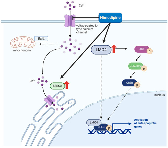 In summary, nimodipine was shown not only to activate the AKT and CREB signaling pathways but also induce the protein levels of LMO4 and SERCA3, whereby the increased expression of LMO4 could lead to the detected reduction in calcium channel expression and intracellular calcium levels under stress (Figure 6). There is also an increased inhibition of GSK3β, which represents a further mechanism in the reduction in cell death. However, whether LMO4 is functionally a key target protein in the molecular mechanism of action of nimodipine needs to be tested by the knockout and overexpression cell models.