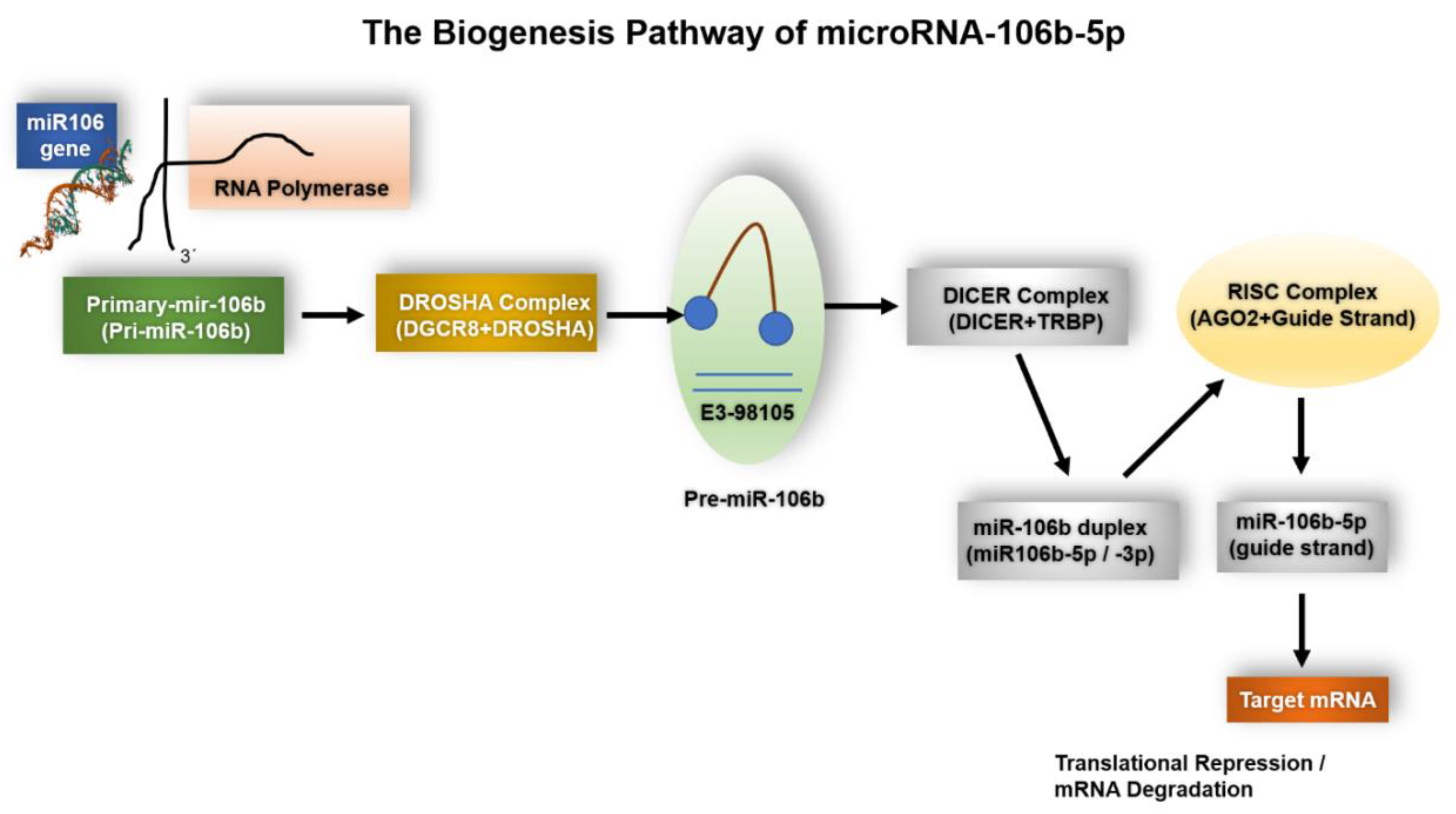 - miR-106b-5p arises from the intronic miR-106b~25 cluster within MCM7 and is commonly co-expressed with its host gene, a relationship with strong relevance for tumor biology [17].