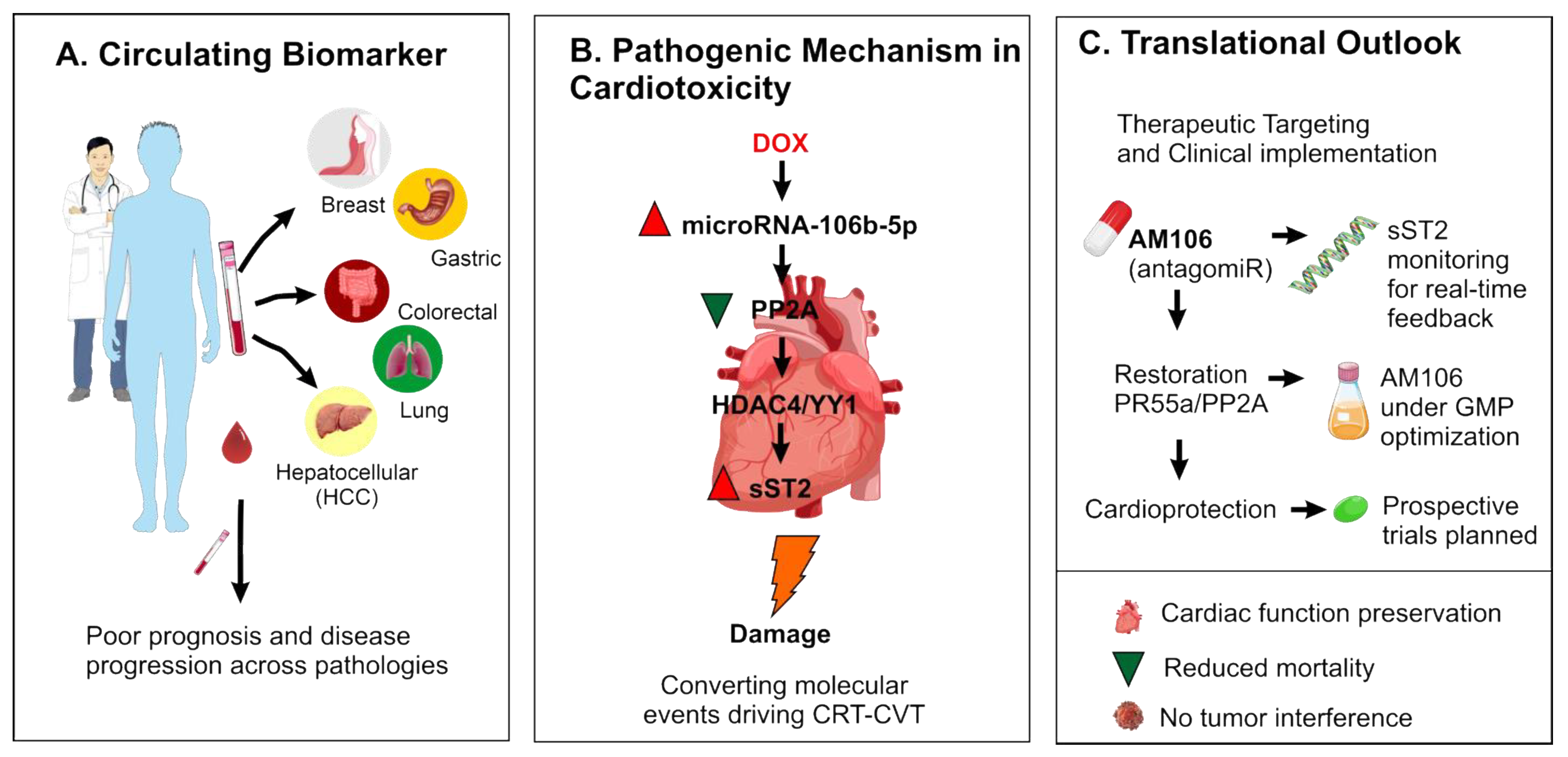 Clinical | Analysis of circulating miRNA levels in cancer patients | Elevated miR-106b-5p correlates with poor outcomes and higher risk of cardiotoxicity when using anthracyclines | Supports the use of miR-106b-5p as a stratification biomarker and guides personalized therapy strategies | [20,94] |