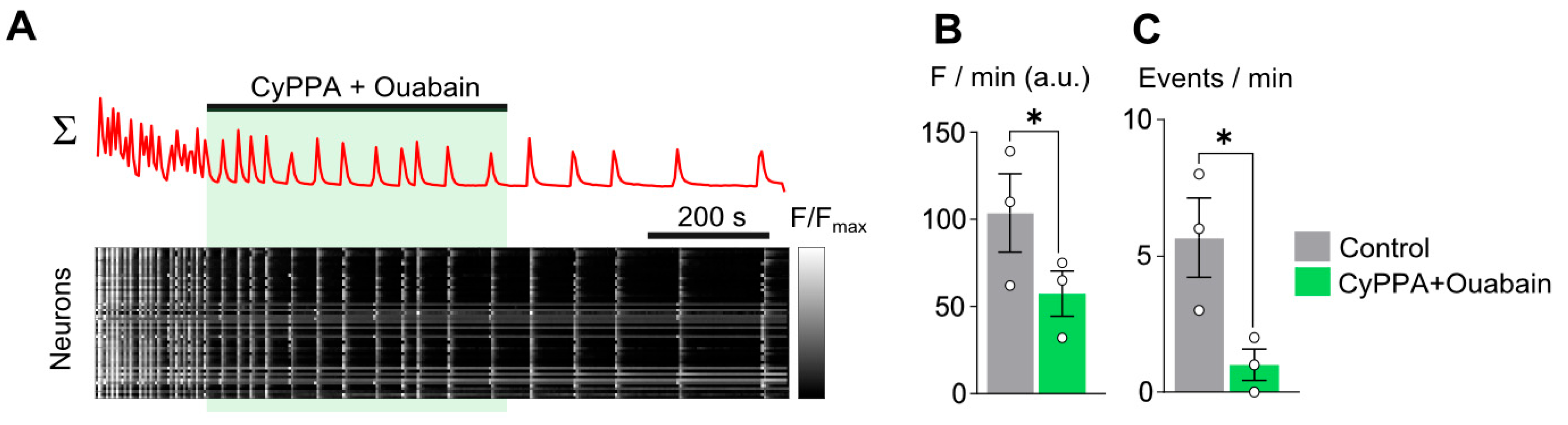 | CyPPA 10 µM + Ouabain 1 nM | 103 ± 22 (n = 3) | 57 ± 13 (n = 3) * | 5.6 ± 1.4 (n = 3) | 1.0 ± 0.5 (n = 3) * | ||