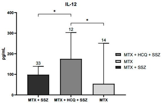 Serum IL-12 levels according to treatment schedule with disease-modifying antirheumatic drugs (DMARDs). Significant increases in IL-12 concentrations were observed in the group treated with MTX, HCQ, and SSZ compared with groups receiving MTX alone or MTX + HCQ (* p < 0.05). Data are expressed as median and interquartile range (pg/mL). Statistical differences were evaluated using the Kruskal–Wallis nonparametric test with Dunn’s post hoc comparison.