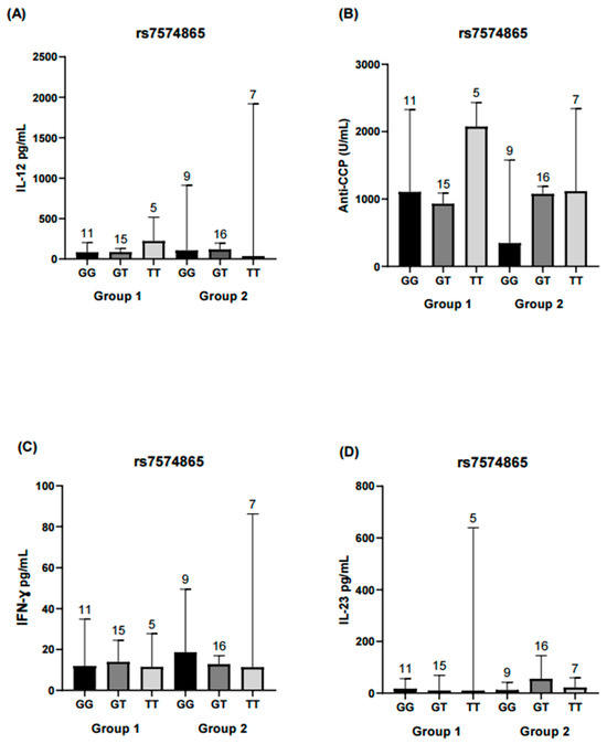 Comparison of IL-12, IL-23, IFN-γ, and anti-CPP levels across rs7574865 genotypes of the STAT4 gene. Each bar represents a genotype (GG, GT, TT). Group 1 corresponds to RA patients in remission/low disease activity, and Group 2 corresponds to patients with moderate/high disease activity. (A) Serum IL-12 levels in both activity groups, showing no significant differences among genotypes. (B) Anti-CCP antibody concentrations in Group 2 were higher in TT and GT genotypes compared with GG, whereas in Group 1, higher values were observed in the TT genotype; however, differences were not statistically significant. (C) IFN-γ concentrations did not differ significantly between genotypes in either group. (D) IL-23 levels were similar across genotypes and did not reach statistical significance. Statistical comparisons were performed using the Kruskal–Wallis nonparametric test with Dunn’s post hoc comparison. Numbers above bars indicate the number of patients per genotype in each group.