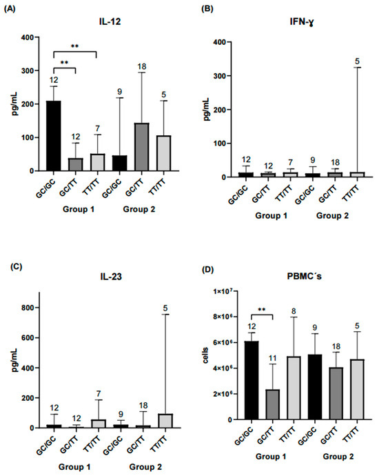 Comparison of IL-12, IFN-γ, IL-23, and PBMCs counts across STAT4 haplotype combinations. Each bar represents a haplotype combination (GC/GC, GC/TT, TT/TT). Group 1 corresponds to RA patients in remission/low disease activity, and Group 2 corresponds to patients with moderate/high disease activity. (A) Serum IL-12 levels in both groups. Patients carrying the GC/GC haplotype combination in Group 1 exhibited significantly higher IL-12 concentrations compared with those with GC/TT or TT/TT (p < 0.01). No significant differences were observed among haplotype combinations in Group 2. (B) IFN-γ concentrations did not differ significantly between haplotype combinations in either group. (C) IL-23 levels were similar across haplotypes and did not reach statistical significance. (D) PBMC counts were significantly higher for the GC/GC haplotype compared with GC/TT in Group 1 (p < 0.01), whereas no differences were detected among haplotypes in Group 2. Statistical comparisons were performed using the Kruskal–Wallis nonparametric test with Dunn’s post hoc comparison. Numbers above bars indicate the number of patients per haplotype in each group. ** Significance value < 0.01.